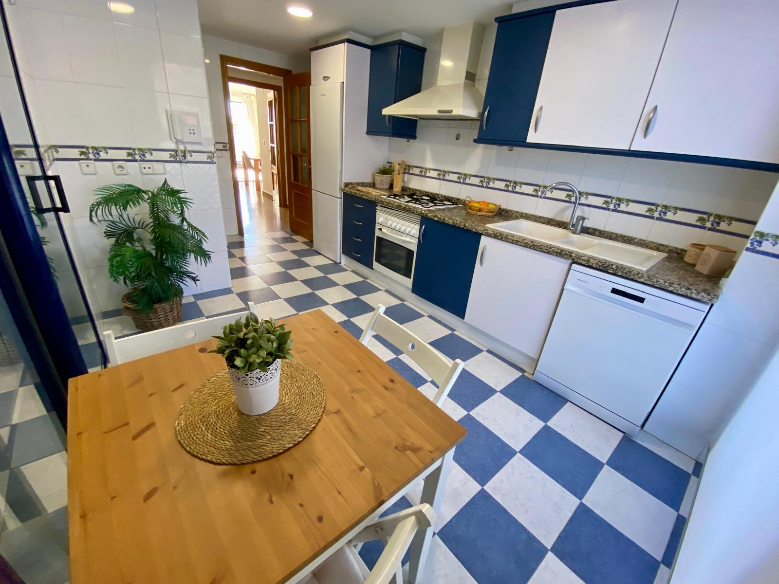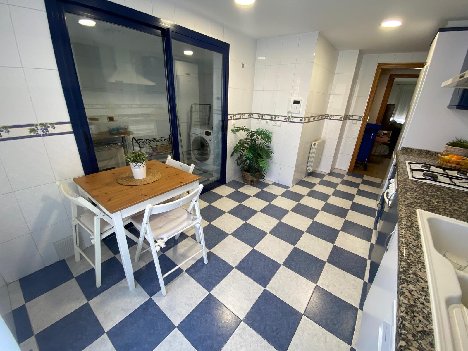 La cocina, totalmente equipada, es un espacio alegre y funcional, ideal para el día a día. Además, incorpora una práctica galería que aporta mayor comodidad al hogar.