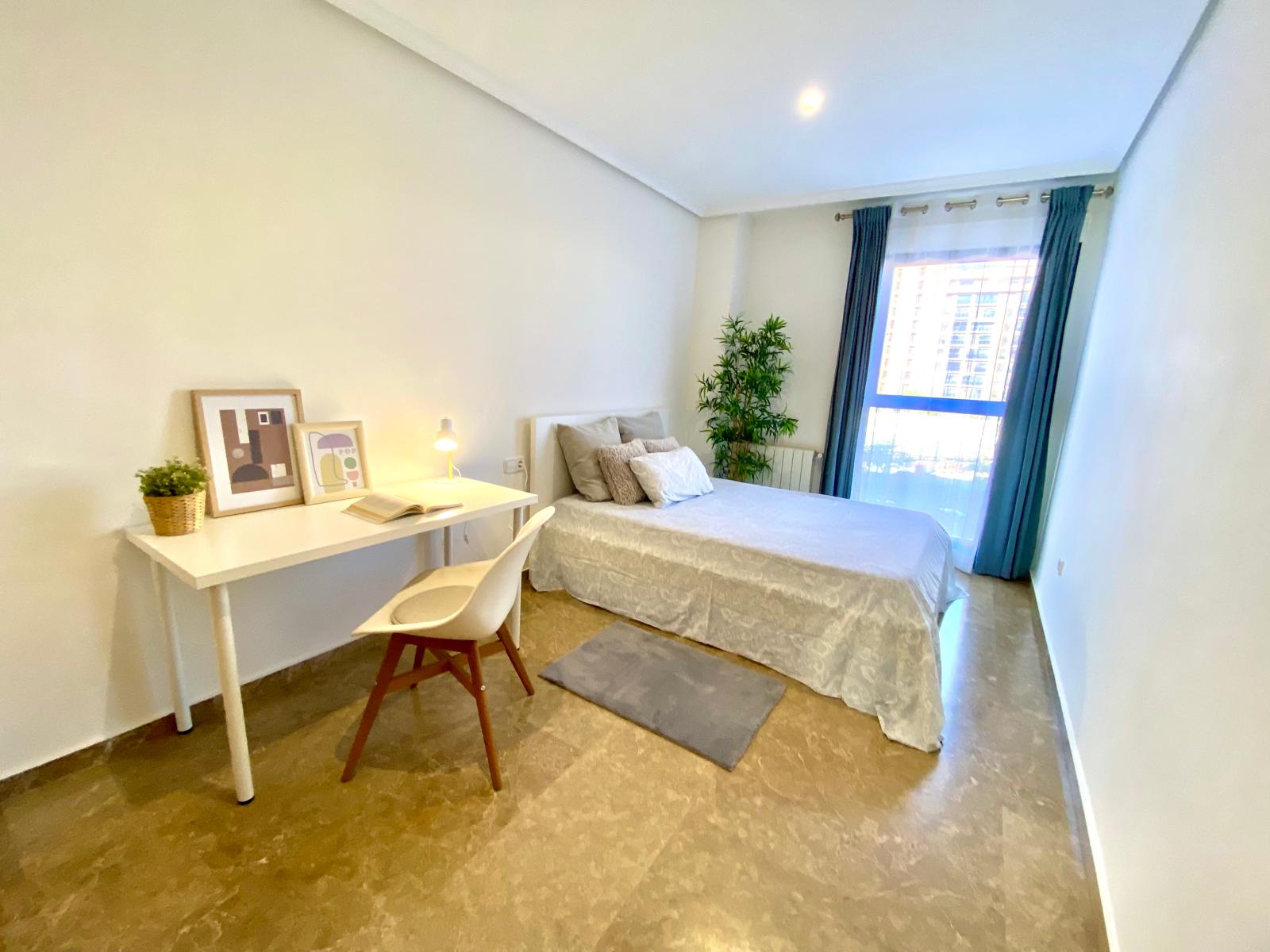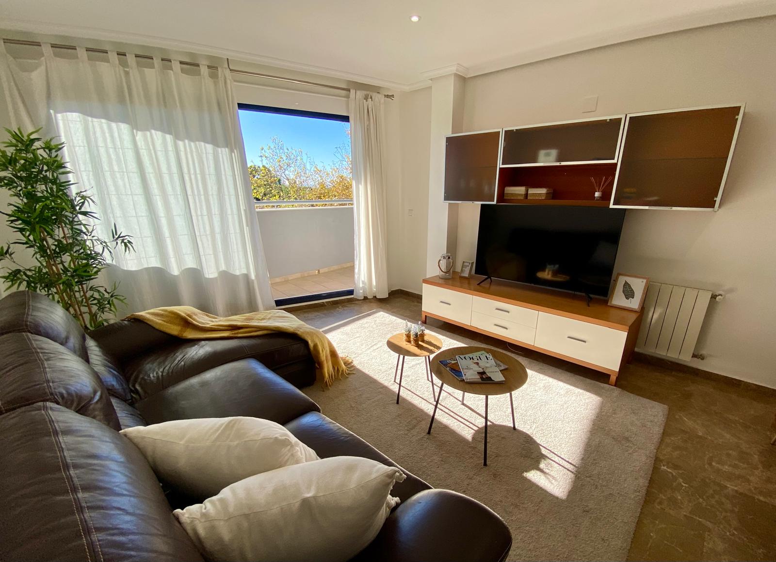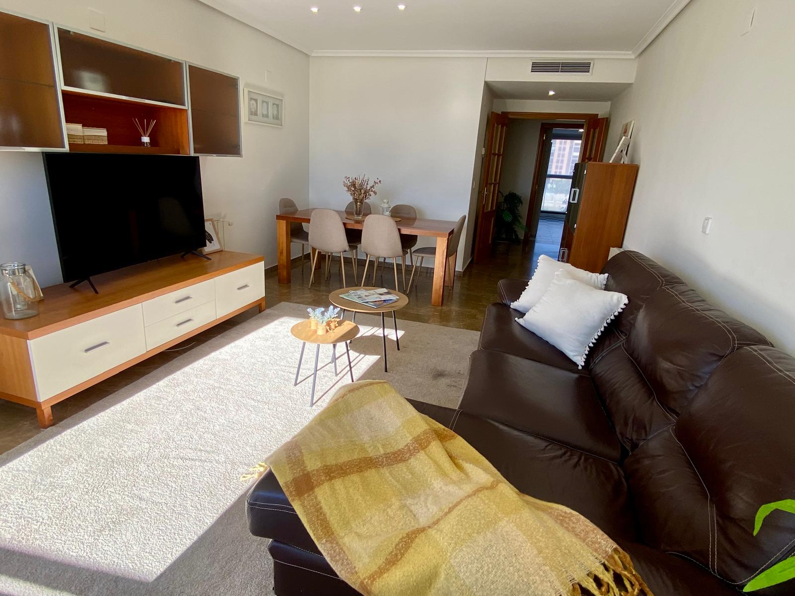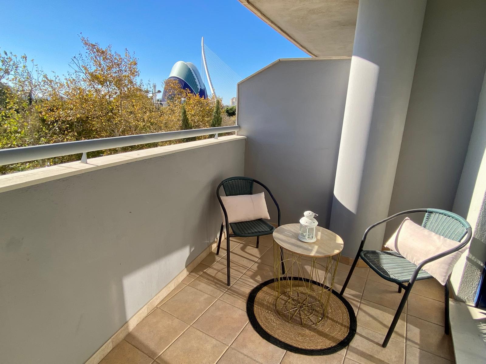 La vivienda, muy luminosa y con elegante suelo de mármol, destaca por su cuidada distribución. Al entrar, nos recibe un amplio salón-comedor con un gran ventanal que inunda el espacio de luz natural y permite el acceso a una encantadora terraza desde la que podrás disfrutar de vistas despejadas al Oceanogràfic y al Ágora. Un rincón perfecto para relajarte o compartir momentos especiales al aire libre.